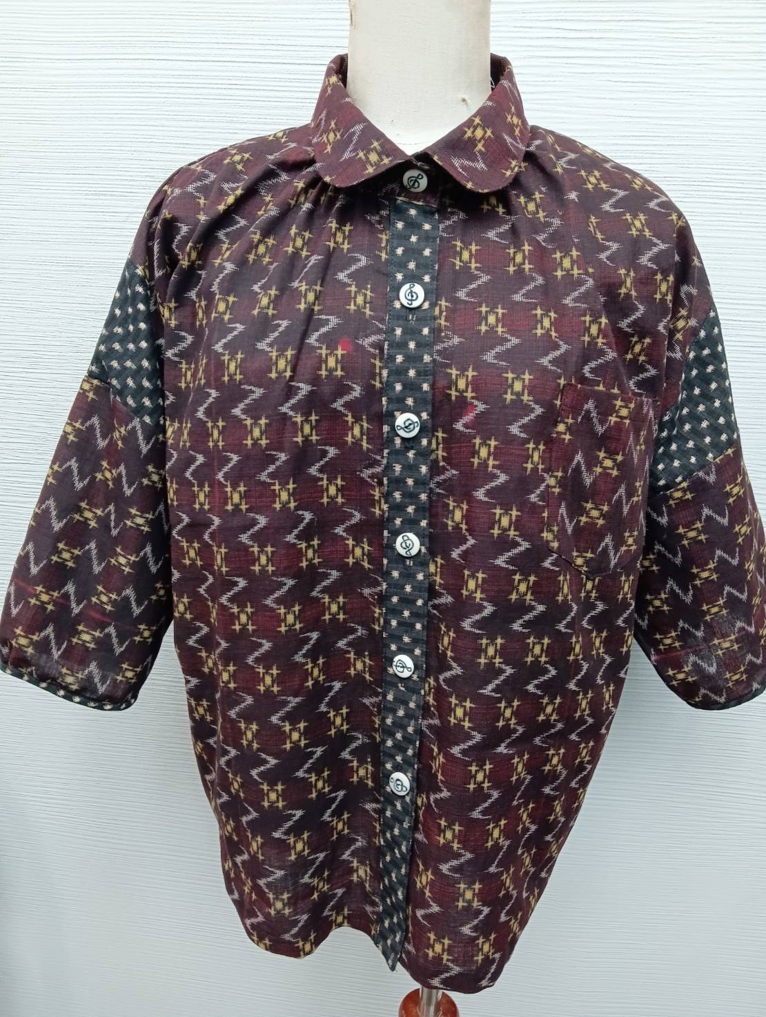 **bl-28 ブラウス**は、古典柄の着物生地で制作され シャーリングデザインが特徴の女性らしいオーバーブラウスです。裾ラインは脇をあげた柔らかな形状で、様々な体型を美しく演出します。純粋な綿100%の素材は、肌に優しく、快適な着心地を実現しています。