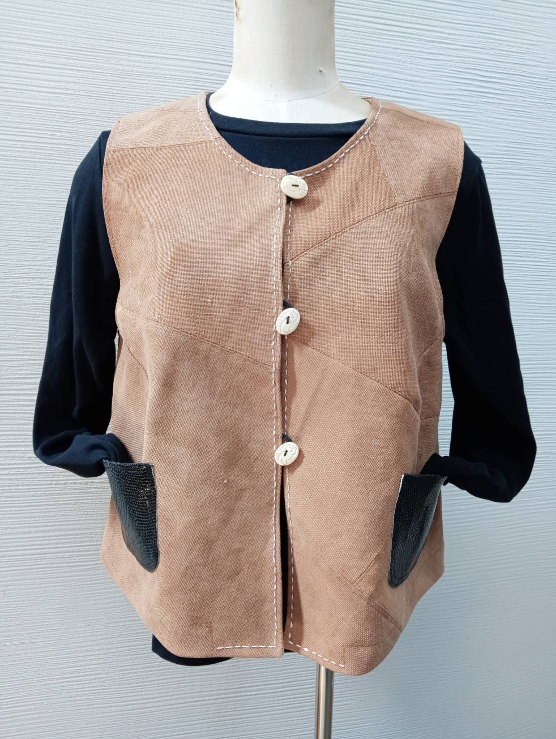 **bs-13 酒袋ベスト**は、独自のパッチワークから生地を作成した特別なアイテムです。綿100%の素材で作られており、胸のダーツが体にフィットし、美しいシルエットを実現します。水牛の角彫刻によるボタンや、皮革のループ、パイソンのポケットがデザインのアクセントとなり、独自の個性を引き立てています。刺し子ステッチが施されアクセントとしても目を引きます。細部にまで拘ってお作り致しております。