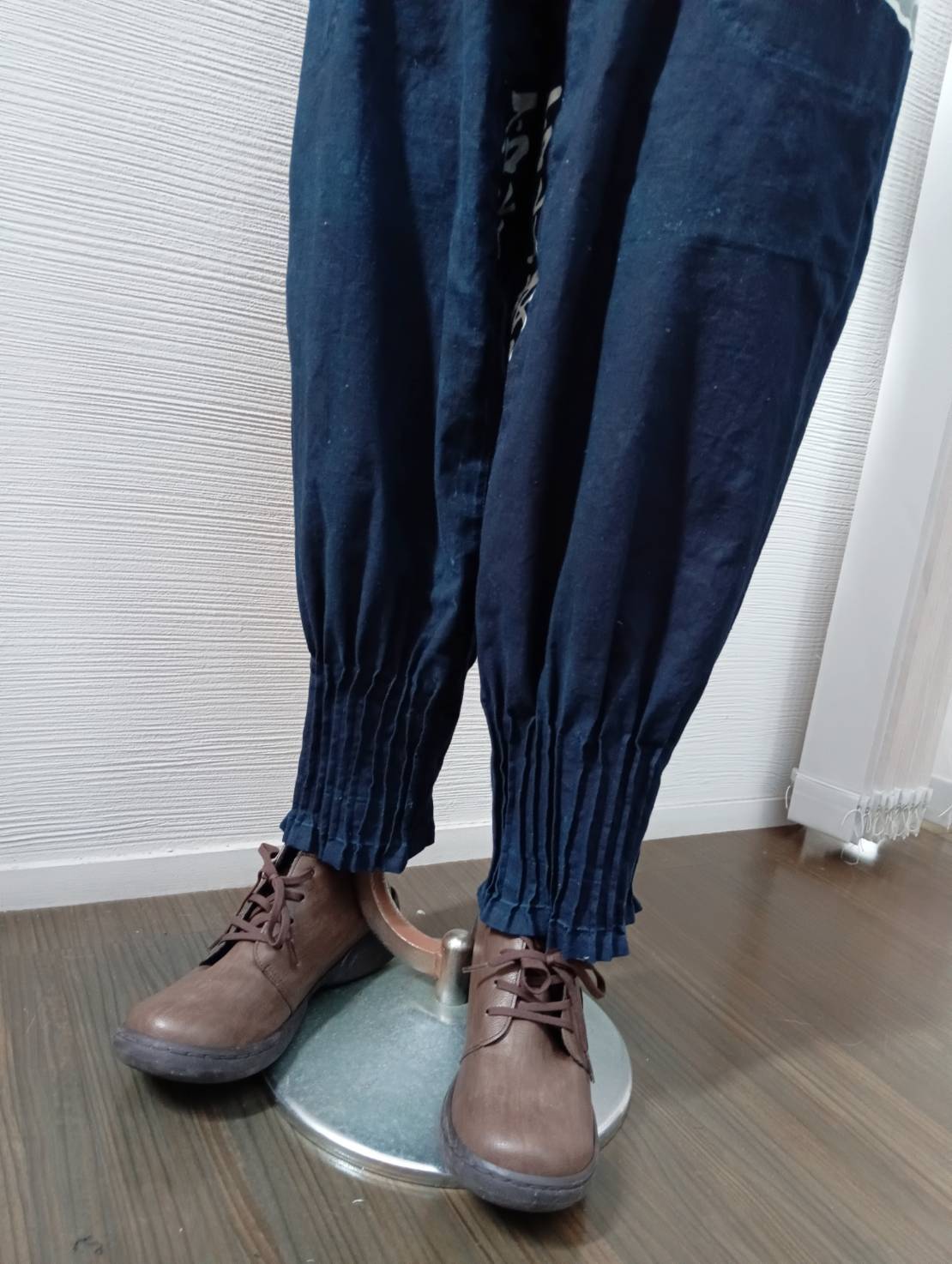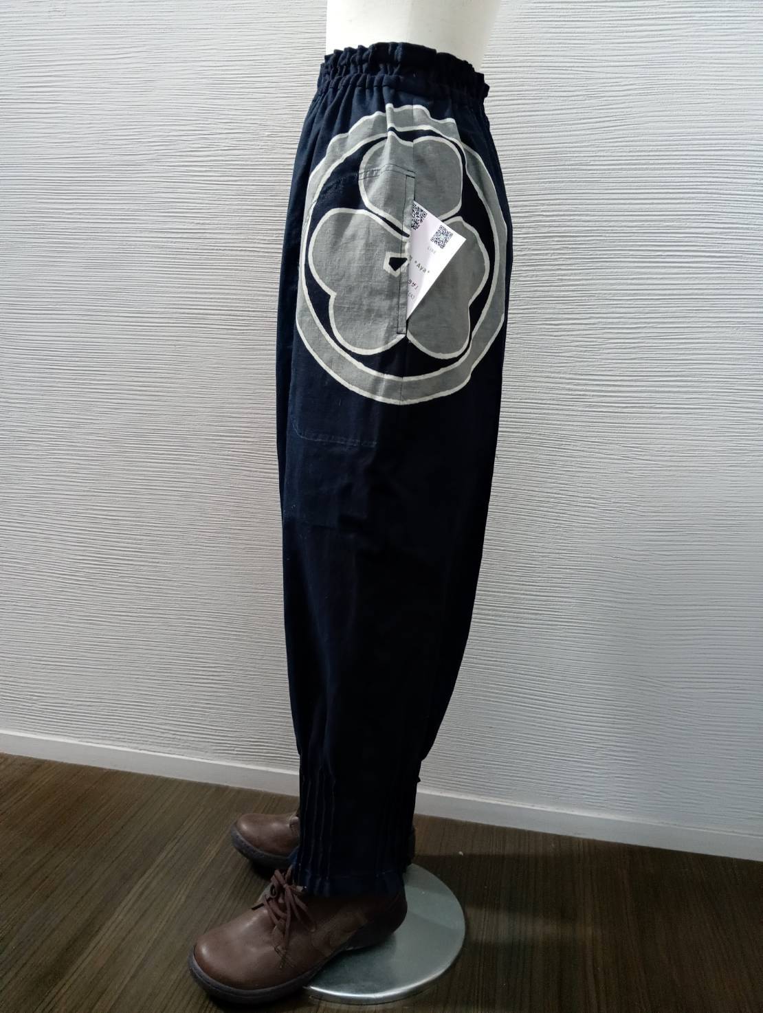 **pa-5 古布藍染めパンツ**は、古布藍染め半纏を使用した贅沢なアイテムです。綿100%のしっかりとした生地感が特徴で、普段使いから特別なシーンまで幅広く活躍する一着です。両脇にはシームポケットが施されており、機能性とデザイン性を兼ね備えています。特に珍しいグレーの紋が目を引き、裾にはピンタックが施されており、柔らかなラインを演出します。