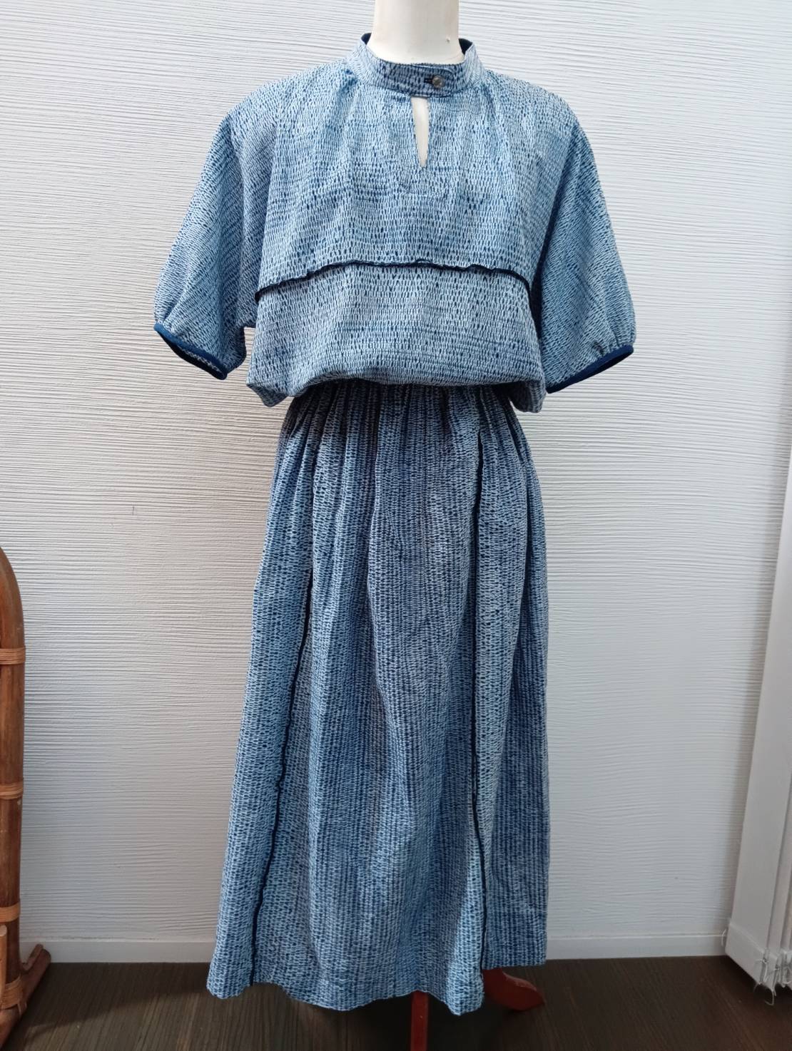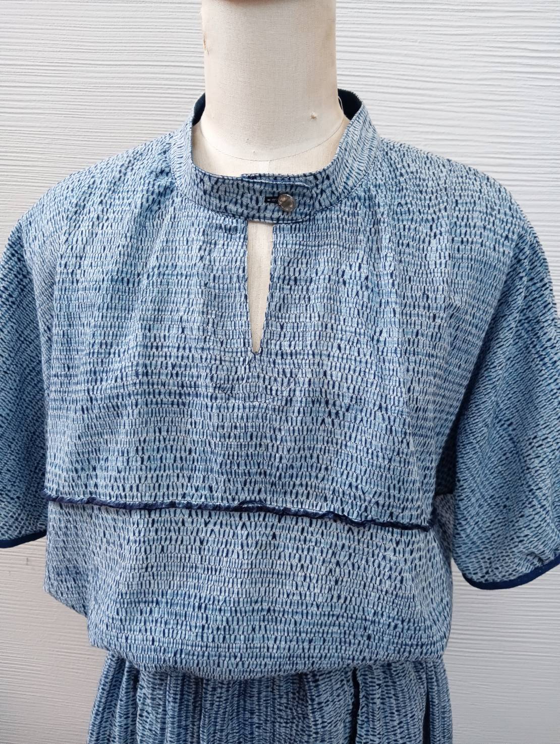 **wn-7 藍染めの杢目絞りワンピース**は、一反(12m)をチクチク一目縫いで網状にして染めた大変高価なアイテムです。ドルマンスリープとマオカラーのオリジナル作品が融合し、浴衣地でありながらも非常にオシャレな雰囲気を醸し出しています。綿100%の素材を使用し、着心地も抜群です。