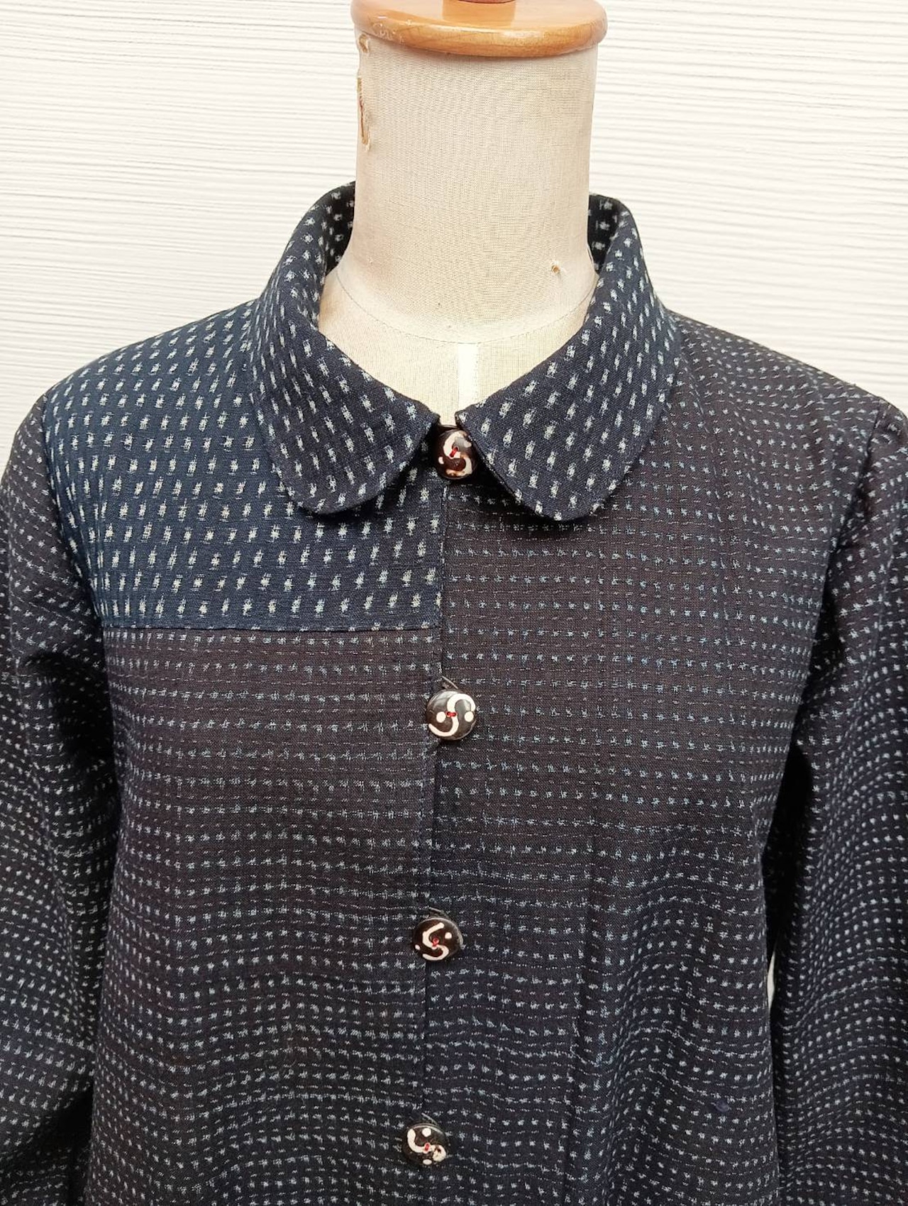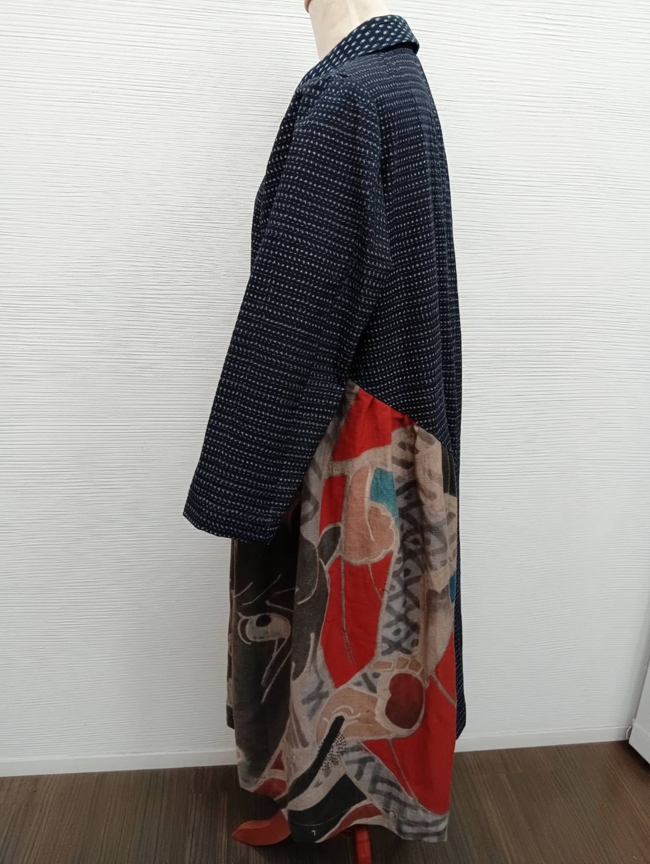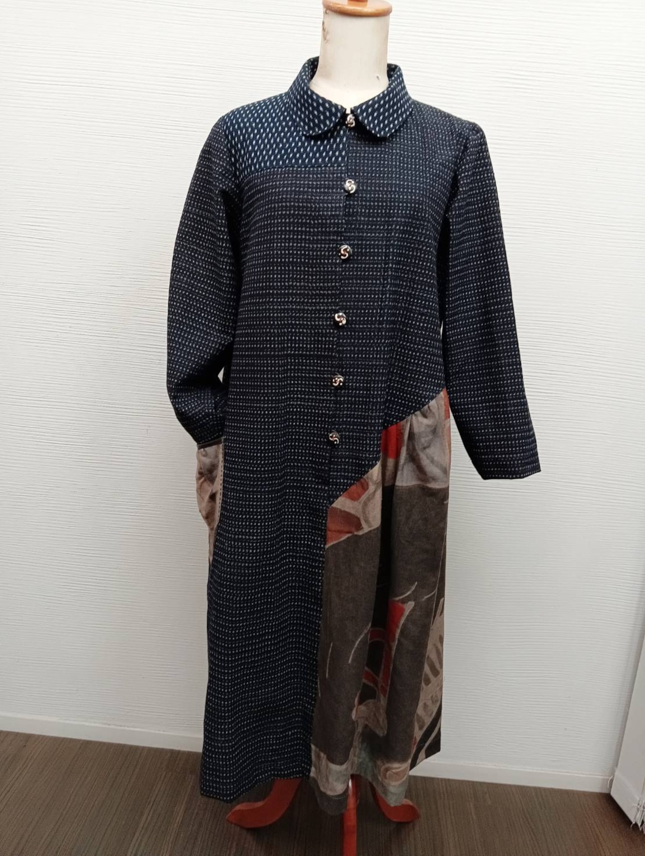 **wn-23 斜めカットギャザーワンピース**は、書生絣と幟旗を草木染めでコラボレーションした、独自の魅力を持つ一着です。綿100%の素材が実現する肌触りの良さと、洗練されたデザインは、日常の着用から特別な場面まで幅広く活躍します。斜めカットのギャザーが、あなたのスタイルに個性的なアクセントを添えます。