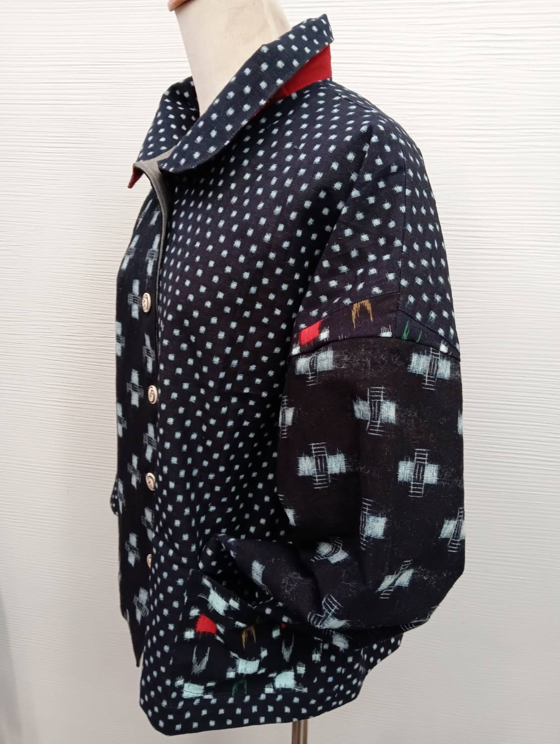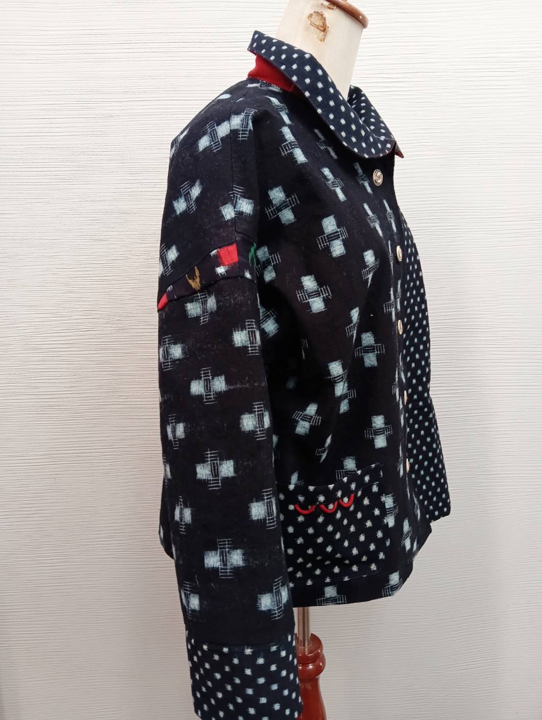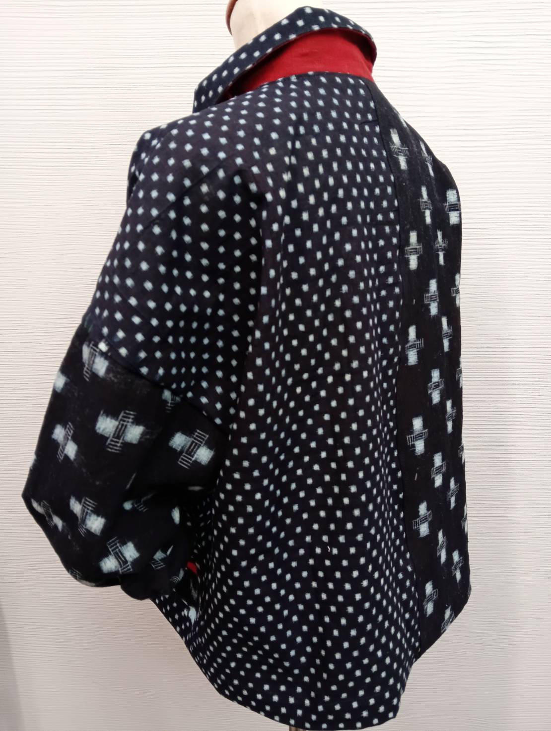 このジャケットの裏地には手拭の墨染めが施され、こだわりを感じさせる仕上がりになっています。美しい水牛の彫刻物ボタンがアクセントとなり、他にはない特別感を演出しています。また、襟裏地には古布紅花染を使用し、立ち襟のデザインが赤の映えを加えています。丈58cm、幅58cmの置き寸が、スタイリッシュなシルエットを作り出します。この絣ジャケットを身にまとって、あなたの日常に新たな彩りを加えてみませんか。